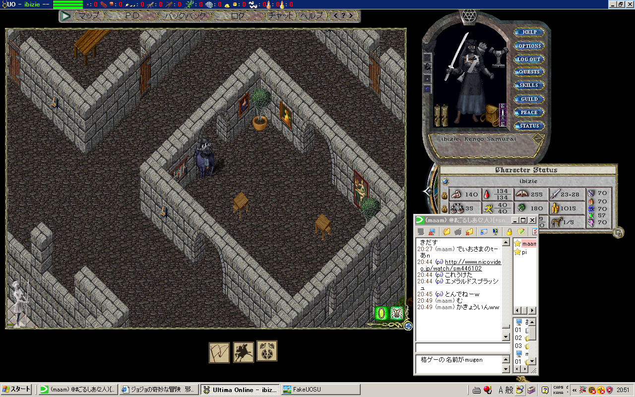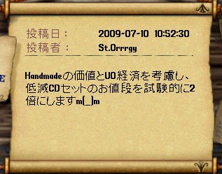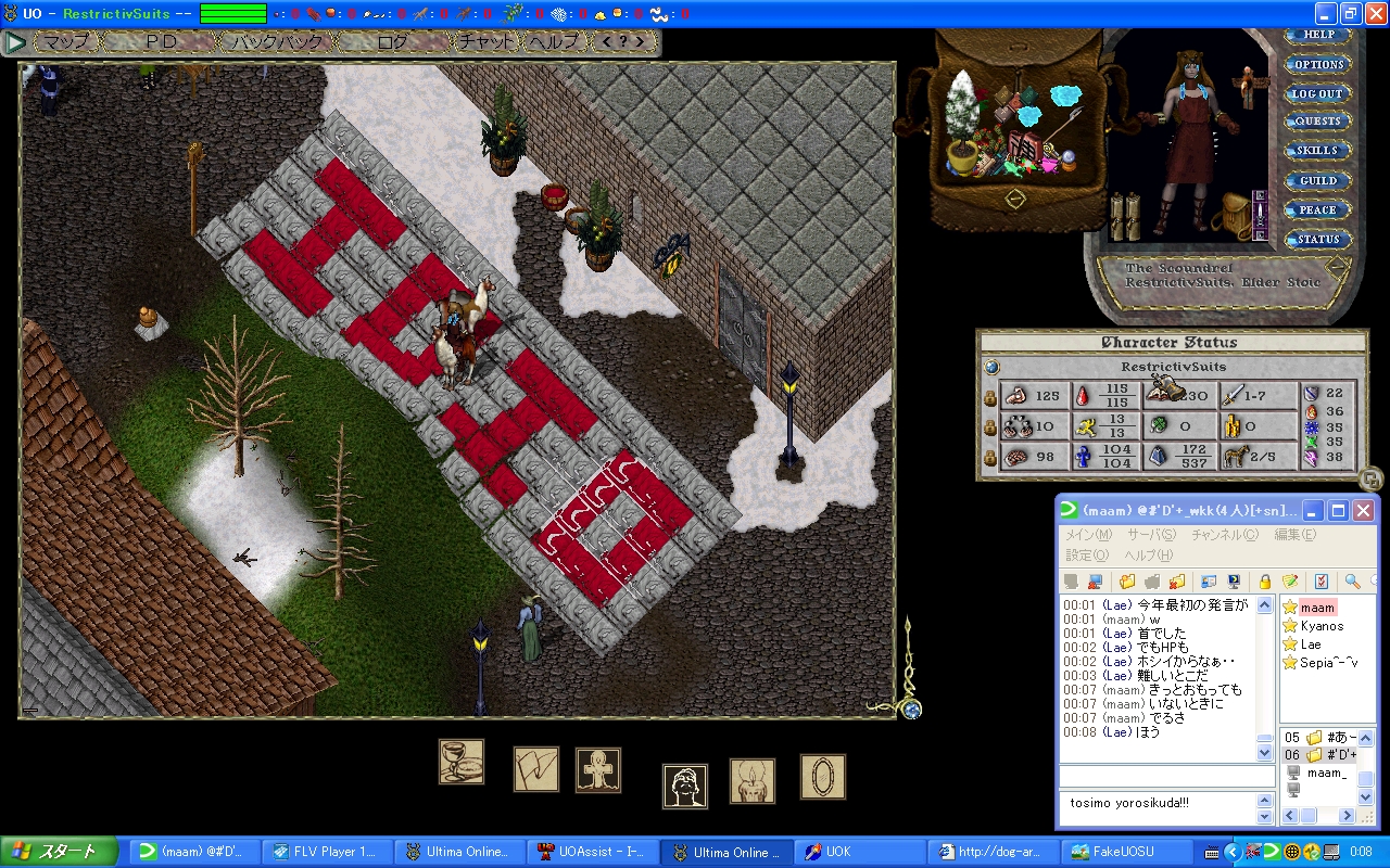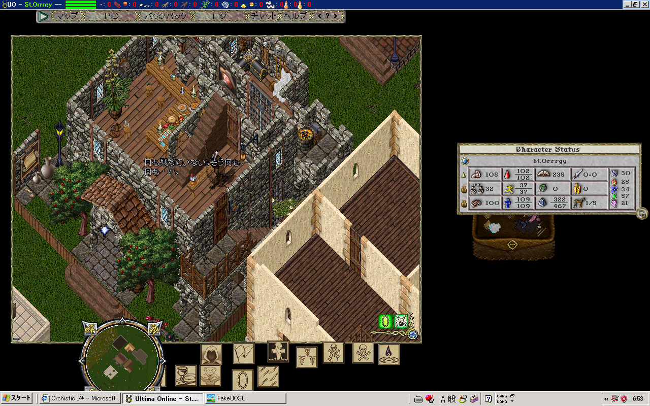 4月に家維持のために課金して6ヶ月後の今日課金しようと思ってたんだけど 家の腐敗は近年止まってたらしんだけど、最近再開されて、それ以降6ヶ月から3ヶ月に縮まってたみたいで、 あっけなく13年間 (開始から・実質は105month位か) は消えさってしまった。 変な話PCに向かえばUOの価値観は優先されるのに現実に戻ると全く低下、ネットゲームの形のない財産って不思議 そして消失 私の青春時代とまたがりやがったこのゲーム 嫌な思い出もあったろうけど、楽しかった時がやっぱ一番覚えてる 殆ど覚えてないけど。でもやっぱ感慨深い またやるとしたら対人のWARとか圏内戦関連?そういう人も未だいるみたいな? マジまたなんかあったら本家、エミュ鯖、他ゲーム(AOS、Diablo大好物)にかぎらず昔のお友達誘ってください! 絶対のってくんで! UO、一人でも全然楽しめたし、2d時代なんかちょーだいすきだった 荷馬は乗れないのかと。 もう 布とか服とかパッチレア、旧アイテム、可愛いアイテム集めとかの趣味の世界には没頭する気にならん 一からはきつすぎるwRMさえあればなんか出来るんだろうけど夢がないし やっぱ思い出 以下画像、 まじめにやったわいばーんりーが等、末期は想い出深いものがいっぱい どう転んでも反りが合わない人、こんな人がネットにいるんだ?(当時のネットへの偏見)と思うくらい素敵な人といっぱい会えた これからもっともっと忘れてしまうのが悲しい PR |